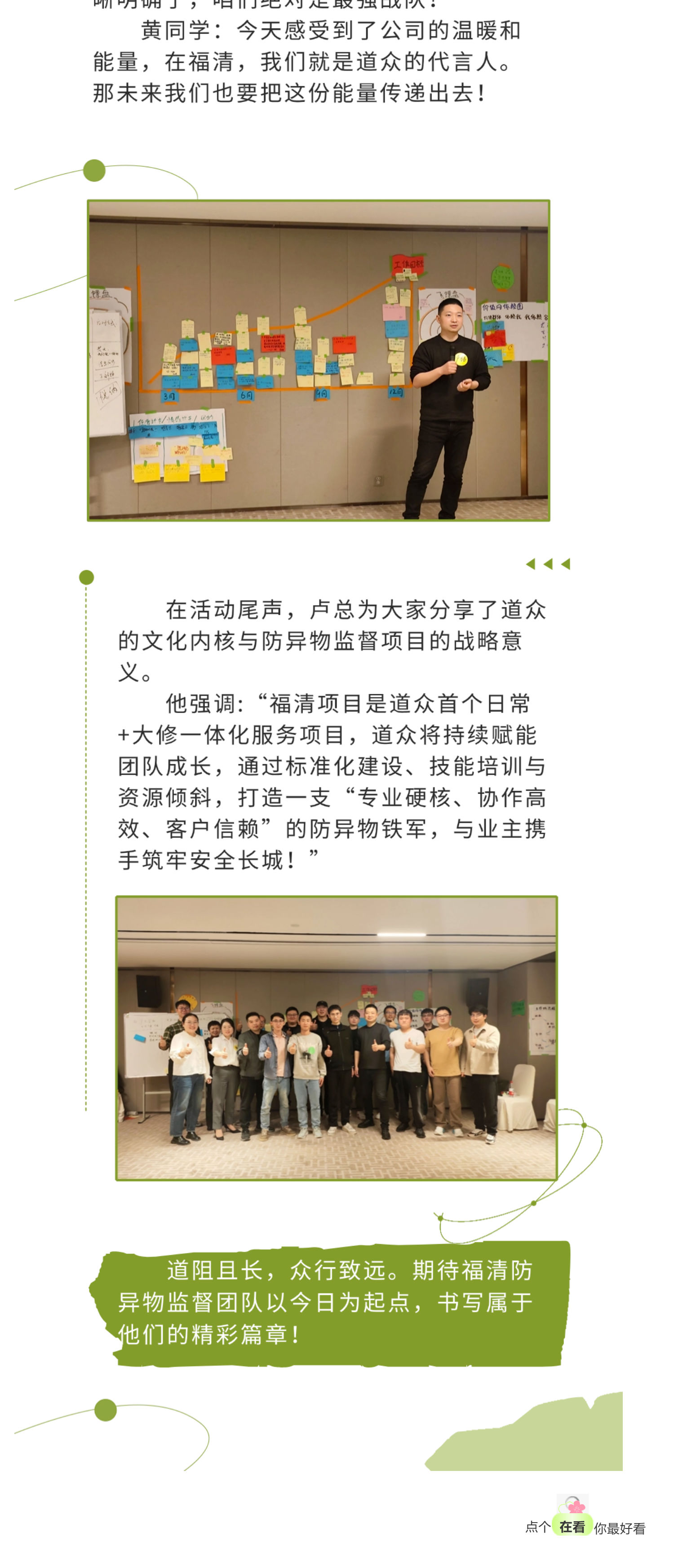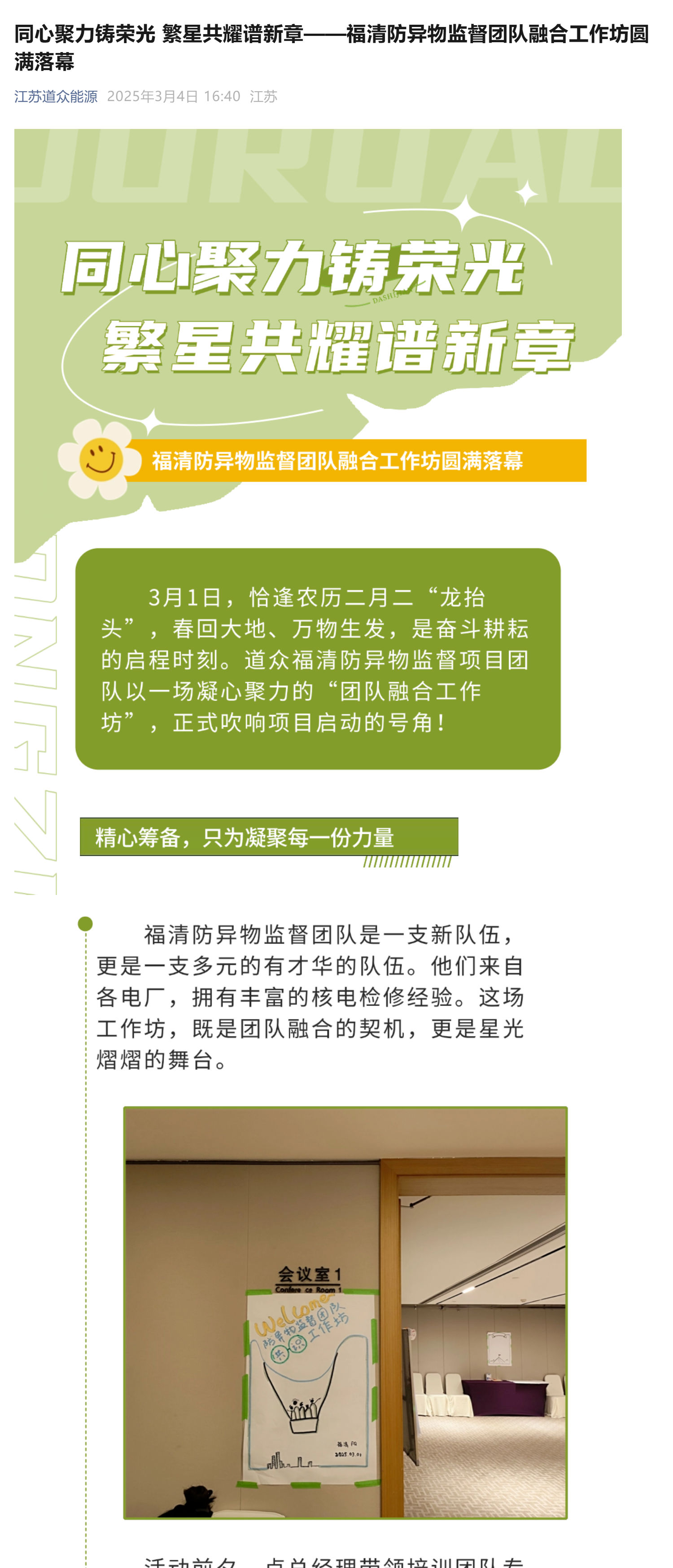 同心聚力铸荣光 繁星共耀谱新章——福清防异物监督团队融合工作坊圆满落幕 首页 / 新闻动态 / 公司新闻 公司新闻 admin_fme 2025-03-04 17:23:42 151 上一篇: 蛇舞新春,变革启航 —— 道众能源年终盛典欢快落幕 下一篇: 价值观标杆人物访谈:赵迎——以主动之姿 绘成长画卷
