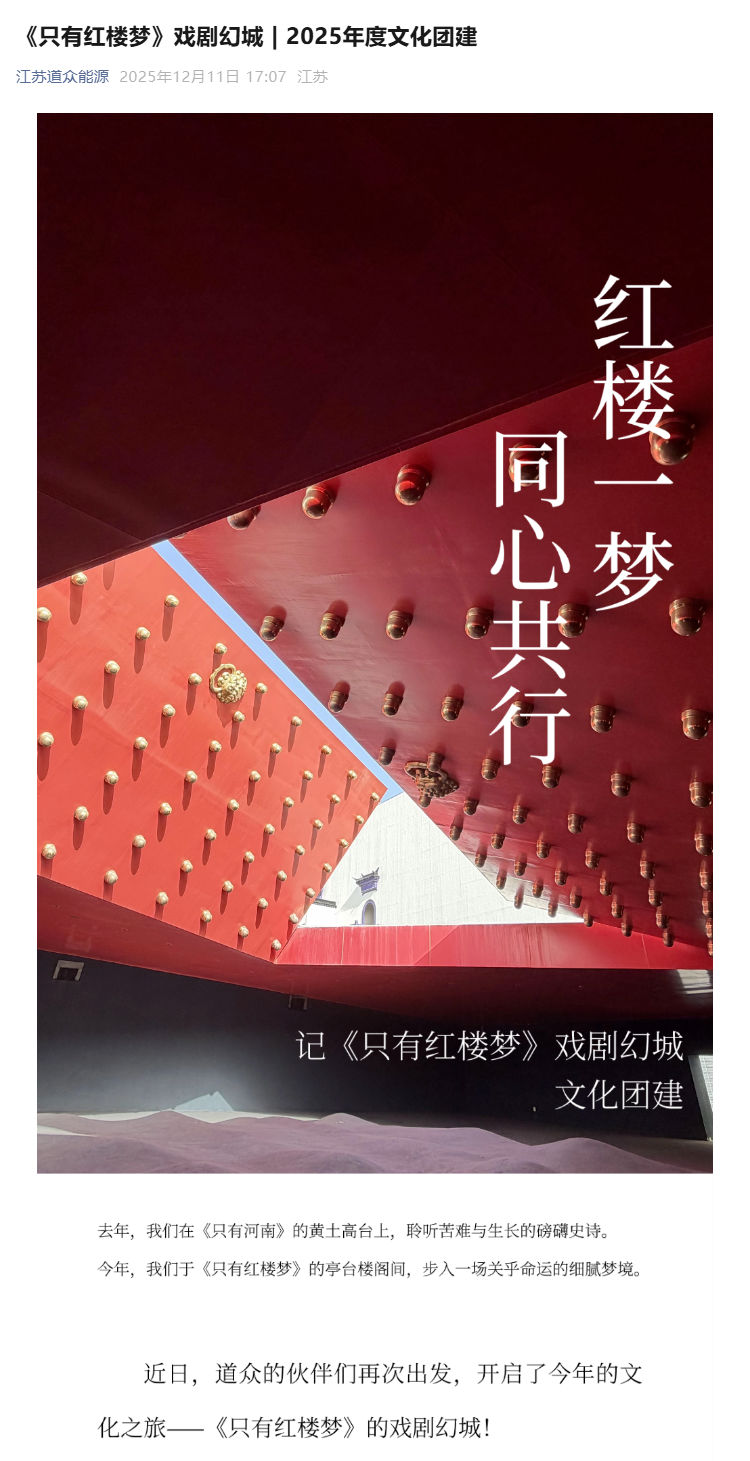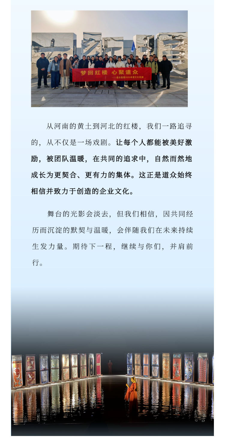 《只有红楼梦》戏剧幻城 _ 2025年度文化团建 首页 / 新闻动态 / 公司新闻 公司新闻 admin_fme 2025-12-11 14:00:37 555 上一篇: 六年温暖相伴,道众2025重阳活动圆满落幕 下一篇: 坚守与协同 _ 道众团队的温暖力量_壹伴长图