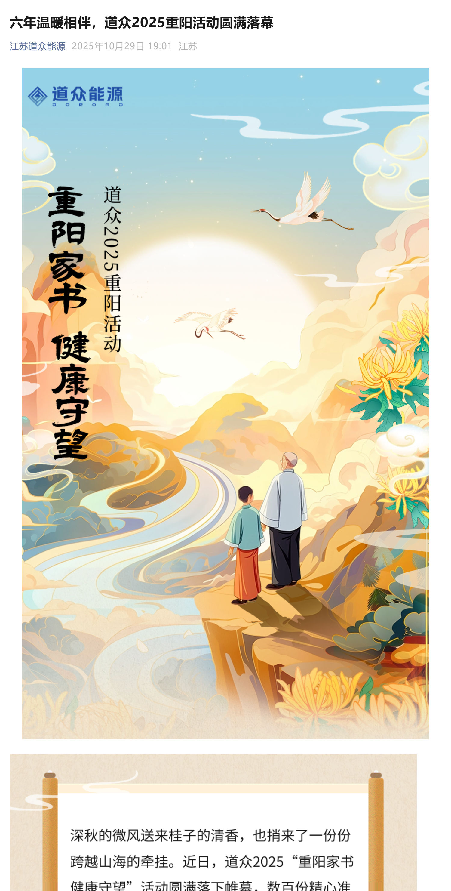 六年温暖相伴,道众2025重阳活动圆满落幕 首页 / 新闻动态 / 公司新闻 公司新闻 admin_fme 2025-10-29 14:14:05 690 上一篇: 道众能源荣获“2024年江苏瞪羚企业”称号 下一篇: 《只有红楼梦》戏剧幻城 _ 2025年度文化团建